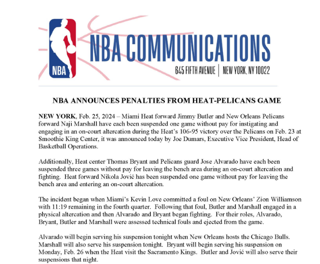 来源:24直播网02-26 14:0424直播网02月26日讯 ,NBA官方正式公布热火和鹈鹕冲突的罚单,巴特勒、马绍尔禁赛1场,约维奇停薪禁赛1场,阿尔瓦拉多和托马斯-布莱恩特停薪禁赛3场;5人累计禁赛9场,损失金额超过37万美元,巴特勒一人损失接近26万美元。
