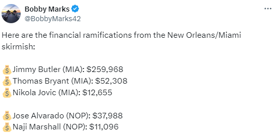 据薪资专家Bobby Marks计算,巴特勒损失了259968美元,托马斯-布莱恩特损失了52308美元,约维奇损失了12655美元,阿尔瓦拉多损失了37988美元,马绍尔损失了11096美元;5人累计损失超过37万美元,其中巴特勒一人损失将近26万美元。