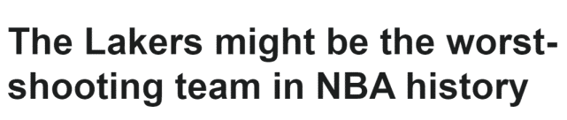 数据说明了他们的投篮有多么糟糕。赛季至今,湖人118次三分出手,只有21.2%的命中率。他们的跳投命中率只有23%,整体命中率也只有40.7%。自2014-15赛季的76人队以来,没有一支球队的整季命中率低于41%,而当时那支76人是为了摆烂这么做的。
