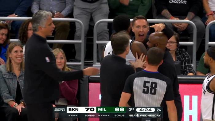 杜兰特第三节拿到12分4篮板,可篮网根本防不住杀疯的字母哥,字母哥单节狂砍17分;篮网被反超,纳什因不满判罚,抱怨裁判以及暴怒指着裁判破口大骂,连吃两T被驱逐离场,执教生涯首次被驱逐。