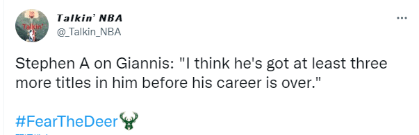 字母哥带队逆转篮网并且狂砍43+14狂刷纪录,名嘴A-史密斯公开喊话:字母是不可阻挡的,我不否认这一点。我认为他退役前至少能再夺三冠。