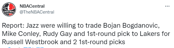 休赛期至今,关于的威少的交易方案有很多,湖人也曾与多支球队谈判交易威少,但结果都以失败而告终;据美媒NBACentral报道,爵士曾愿意把博扬、康利、盖伊和一个首轮签交易到湖人,换来威少和2个首轮签,如此交易方案被湖人拒绝了。