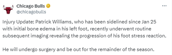 公牛官宣帕威赛季报销:左脚骨水肿确定手术 全队3人因伤报销太惨