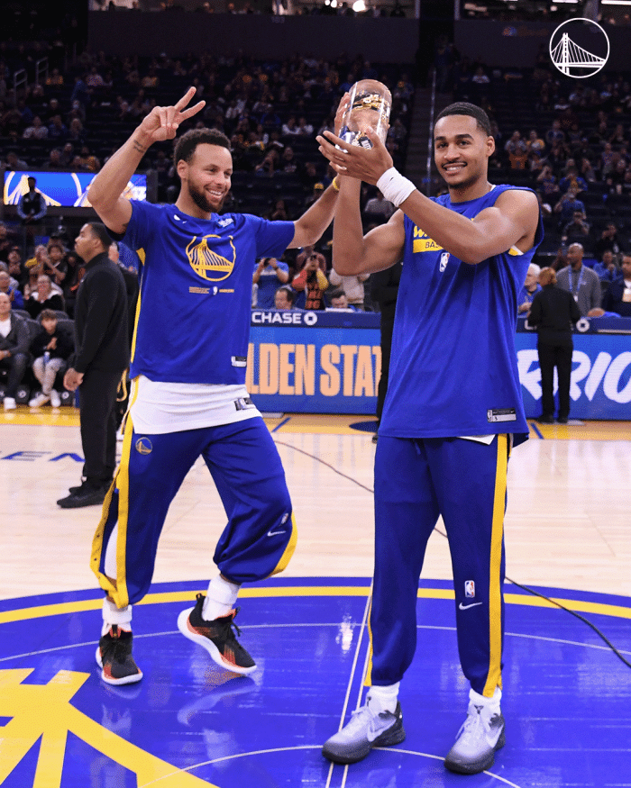 赛前,库里为普尔颁发上赛季罚球冠军奖杯,库里站在普尔身后比出2的手势,库里仅落后普尔0.2个百分点。