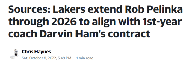 珍妮-巴斯领导的湖人团队,希望管理层和教练的任期能保持一致。佩林卡的合同将与新帅哈姆同时到期,此前哈姆签下了一份为期四年的合同。