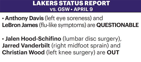 来源:24直播网04-09 11:0224直播网讯 北京时间4月9日,湖人和勇士关键卡位战的伤病报告出炉,詹姆斯生病和浓眉左眼酸痛都是可能出战,湖人三将继续伤停;勇士队库里轮休一场后将回归,维金斯大概率复出。