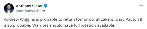 勇士队伤病报告,维金斯大概率复出大战湖人,勇士跟队记者Anthony Slater报道,维金斯和佩顿的状态均为大概率出战,加上昨日比赛轮休的库里,明日勇士对阵湖人应该可以全员出战。