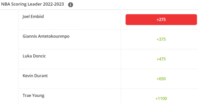 先来看看得分王的赔率排名,前五依次是恩比德(+275)、字母哥(+375)、东契奇(+475)、杜兰特(+650)和特雷-杨(+1100)。上赛季,恩比德以场均30.6分的表现生涯首夺得分王,新赛季,他被看好蝉联这一奖项。而字母哥上赛季场均29.9分,被视为新赛季恩比德竞争得分王的最大对手,此外火力很猛的东契奇、杜兰特和杨也都排名靠前。