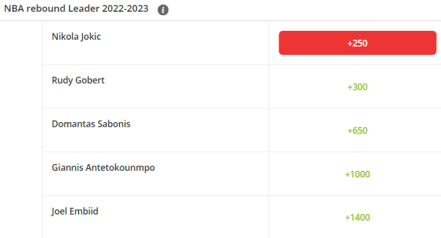 接下来是篮板王的赔率排名,前五依次是约基奇(+250)、戈贝尔(+300)、小萨博尼斯(+650)、字母哥(+1000)和恩比德(+1400)。约基奇成为篮板王的头号热门,虽然他从未成为篮板王,但上赛季约基奇场均13.8个篮板,仅次于戈贝尔。排名第二的戈贝尔是上赛季的篮板王,那也是他生涯首次成为篮板王。加盟森林狼后,他要与唐斯同场,预计篮板数据可能会有所下降。