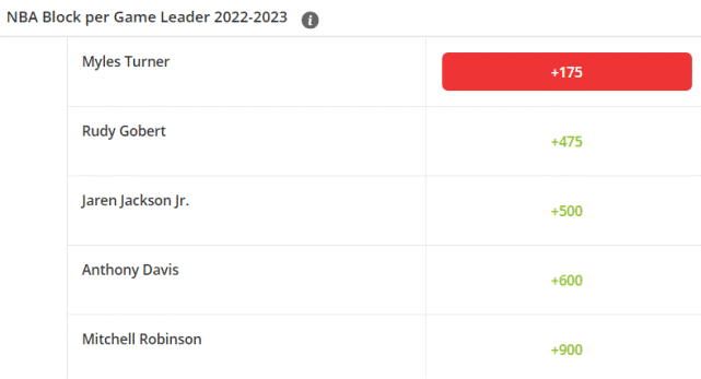 盖帽王的赔率排名方面,前五依次是特纳(+175)、戈贝尔(+475)、小杰克逊(+500)、浓眉(+600)、米切尔-罗宾逊(+900)。和抢断王的情况类似,虽然上赛季的盖帽王是小杰克逊,但特纳的场均盖帽次数(2.8次)要超过小杰克逊(2.3次),也是因为出场次数不够。