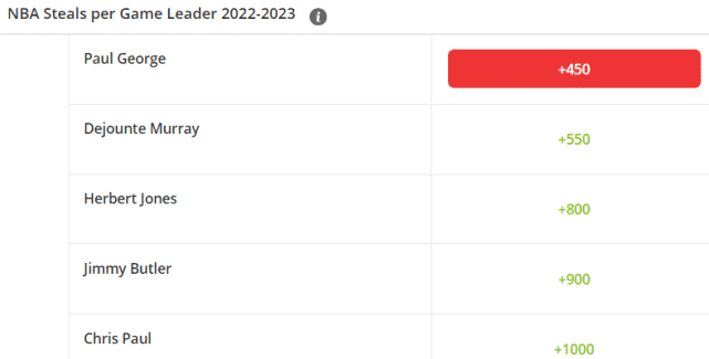 抢断王的赔率排名方面,前五依次是乔治(+450)、穆雷(+550)、赫伯特-琼斯(+800)、巴特勒(+900)和保罗(+1000)。虽然上赛季的抢断王是穆雷,但新赛季最被看好的是快船的乔治。乔治曾在2018-19赛季拿过一次抢断王,上赛季他场均2.2次抢断,实际比穆雷(2.0次)高,但因为只打了31场比赛,不够参与数据排名。