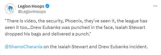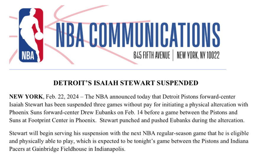 在此前太阳对阵活塞赛前,斯图尔特和尤班克斯在球馆后方发生冲突,活塞悍将挥拳打到尤班克斯的面部,当地警方介入此事,NBA联盟介入调查。太阳官方第一时间发表声明:(斯图尔特)无缘无故袭击尤班克斯,此类暴力行为是不可接受的。我们明确支持尤班克斯,并将继续与当地执法部门和NBA合作。