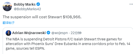 来源:24直播网02-23 17:4424直播网02月23日讯 ,NBA官方公布罚单,活塞球员斯图尔特因在球员通道挥拳击打尤班克斯,被联盟禁赛三场比赛,损失超10万美元。