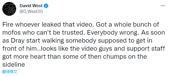 前勇士球员大卫-韦斯特发推:不管是谁泄露了这个视频,必须得辞退。雇了一帮子不能信任的混蛋狗X的。所有人都是有问题的。当追梦开始朝普尔而去的时候,就应该有人出来站在他面前一下……看起来录像的人,视频组的人都比场边的那几个笨蛋要有心眼。