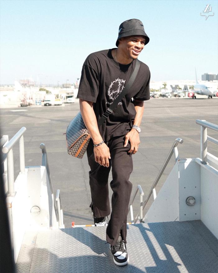威少穿着一身黑色服装并且戴着黑色帽子,斜挎包包一脸笑容;此前湖人惨败,威少在有限的上场时间内,进攻端侵略性十足,不过防守积极性有待提高,总的来说,威少的表现还是不错的。