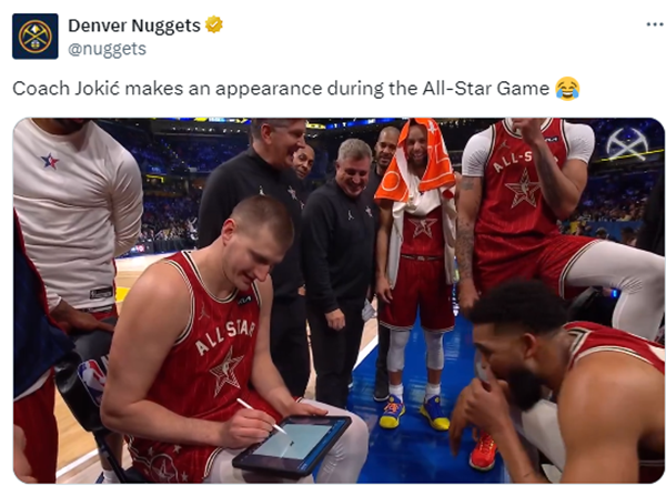 掘金官方晒出约基奇执教全明星的一幕,配文写道:约教练亮相全明星。