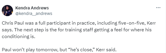 据勇士记者Jason Dumas报道,保罗今日参与了球队的完整训练,明天不会出战湖人但已经接近复出。名记Kendra Andrews补充表示,保罗全程参与了训练,其中包括5V5的训练,下一步是让医务人员进一步了解他的身体状况。