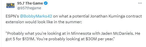 Bobby Marks谈到了库明加的潜在续约,他表示:就像森林狼的麦克丹尼尔斯,他得到了一份5年价值1.36亿美元的提前续约合同,库明加的年薪大概在3000万美元左右。