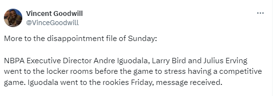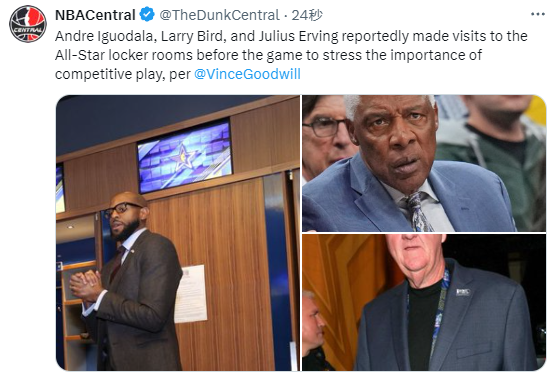Vincent Goodwill透露,在全明星正赛赛前,球员工会执行董事伊戈达拉,NBA名宿拉里-伯德和朱利叶斯-欧文曾前往更衣室,向球员们强调要打出一场有竞争力的比赛。在新秀赛前伊戈达拉也去了更衣室做了相同的事,新秀们收到了他的信息并执行。但正赛上的全明星们,似乎效果没那么好。