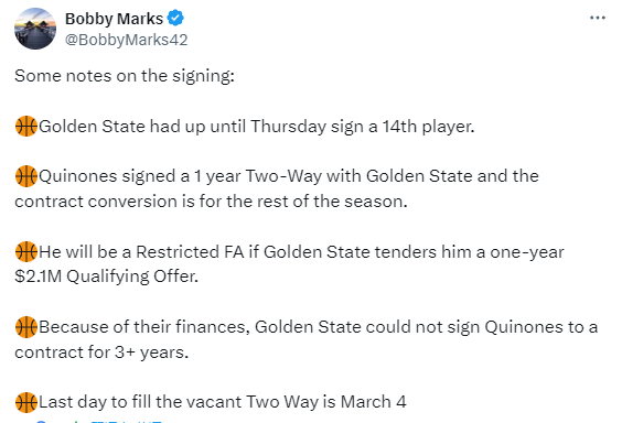 由于勇士队内的财务状况,勇士不能和基诺内斯签下3年以上的合同;勇士填补双向合同的截止日是3月5日。