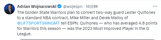 来源:24直播网02-21 10:2324直播网02月21日讯 ,据ESPN名记Woj报道,勇士队计划将基诺内斯的双向合同转为正式合同,23岁的落选秀将获得NBA生涯第一份正式合同;专家解读勇士如此操作的细节,勇士急需签下第14名球员,双方无法签下3年+合同。