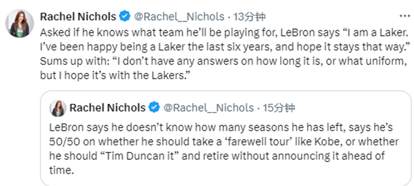 谈到自己的职业生涯余额,詹姆斯表示:我不知道自己还能打多少个赛季,但我知道已经没那么多了。”詹姆斯还用了“可能即将到来”形容。