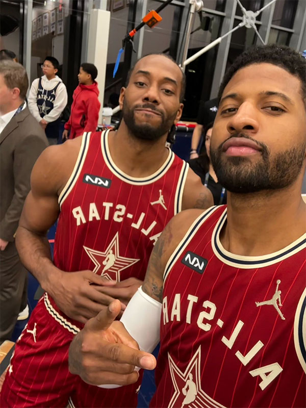 杜兰特拿着全明星戒指来到更衣室,先后拥抱库里、站故事和浓眉,他们四人的更衣柜紧挨着;值得一提的是,这是詹杜库历史首次同队参加全明星赛。
