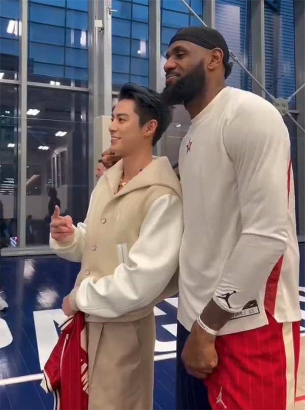 在全明星正赛开打之前,王鹤棣终于见到了自己的偶像勒布朗-詹姆斯——他们两人先是握手致意,之后王鹤棣把准备好的詹姆斯23号全明星球衣递给老詹,老詹为他亲笔签名,两人还合影留念;王鹤棣全程面带笑容,开心之情溢于言表。