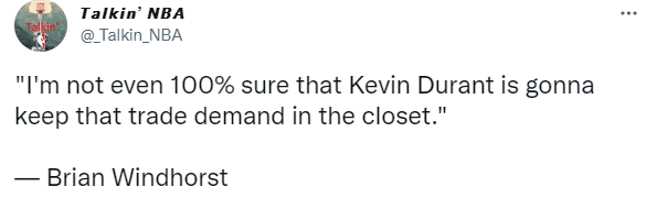 当被问到新赛季选择勇士夺冠还是杜兰特拿下FMVP,Windhorst选择勇士夺冠,理由是:篮网太难让人相信了,我相信他们的天赋,但我不相信他们的凝聚力。预测新赛季的冠军可能是近20年来最难的一次,因为新赛季有太多强队了;在这个问题里我只能选择勇士,因为说实话,我甚至不确定杜兰特会不会重启交易申请,如果他们没打好的话。