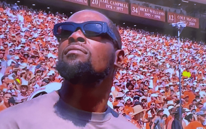 NCAA橄榄球常规赛,得克萨斯大学在主场迎战阿拉巴马大学,篮网巨星杜兰特回到母校得克萨斯大学,现场观看本场比赛,杜兰特戴着墨镜亮相,与多名友人拥抱,与现场女球迷合影并且做出支持“长角牛队”的手势;杜兰特这该死的气质,又被拿捏得死死的。