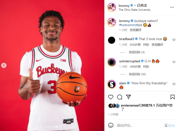 布朗尼晒球衣照引热议,众美媒刷屏转发布朗尼身穿七叶树队的球衣照,奇才球星比尔在评论区写道:这件3号球衣太好看了;詹姆斯转发布朗尼的动态,配文写道:O-H(俄亥俄州立大学)#未承诺。