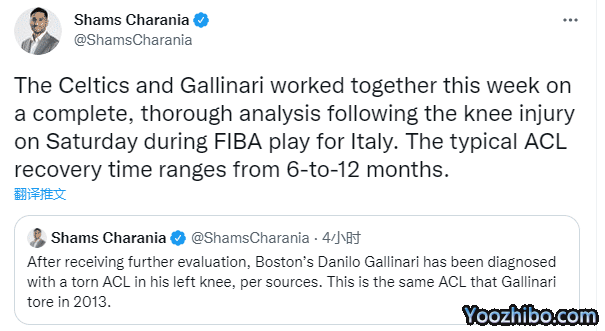 加里纳利何时能够复出?名记shams报道,加里纳利这次撕裂的韧带和13年撕裂的是同样的韧带,一般这种伤病需要12个月的康复期。