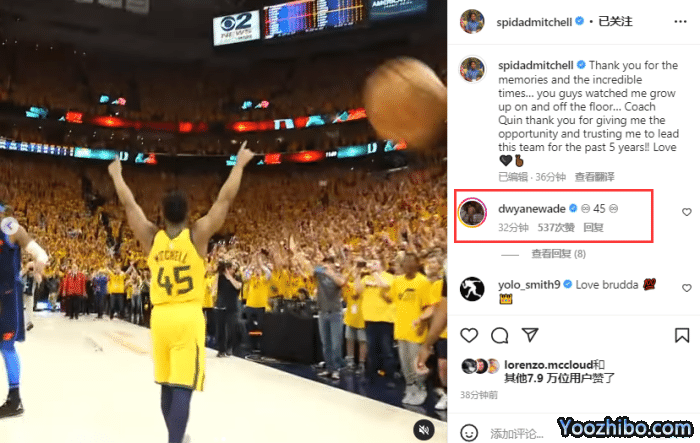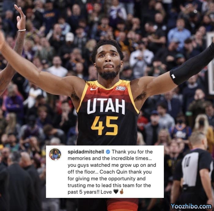 米切尔告别爵士,感谢球队,感谢恩师斯奈德;值得一提的是,爵士小老板韦德第一时间在评论区写道:永远的45号。