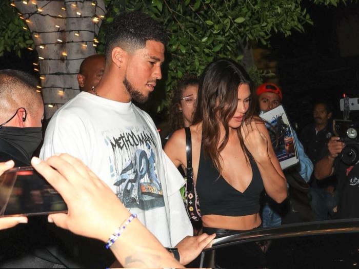 25岁的布克身穿白色卫衣和休闲牛仔裤,26岁詹娜身穿性感上衣,搭配皮裤出镜,两人在西好莱坞的Catch餐厅共进晚餐,离开时被抓拍到。