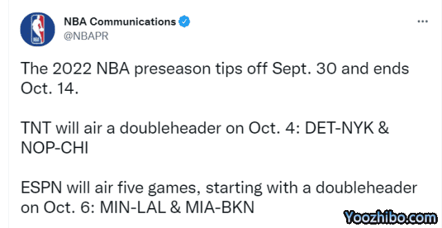 NBA官宣季前赛赛程:勇士10月10日战湖人 篮网连续对阵3大劲敌