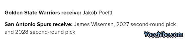 来源:24直播网08-25 20:4024直播网08月25日讯 随着杜兰特逼宫闹剧的结束,联盟还会有什么交易发生吗?北京时间8月25日,美媒Bleacher Report支招勇士3换1升级内线,来提升新赛季卫冕的概率。具体方案是勇士说送出怀斯曼、2027年次轮签和2028年次轮签,得到马刺中锋珀尔特尔。
