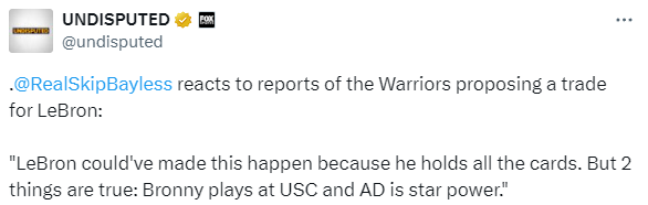 詹姆斯和库里险联手的流言引热议,名嘴Skip在节目中表示:詹姆斯完全可以让联手库里这件事情变成真的,他掌控着一切。但布朗尼在南加州大学打球,浓眉仍然拥有明星级别的能力。