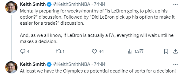 名记Keith Smith发推表示:请做好准备,在接下来的几周、几个月的时间里,人们将持续讨论‘詹姆斯是否会执行他的球员选项’。除此之外还有,‘詹姆斯执行球员选项是否是为了让交易更容易’。众所周知,如果詹姆斯真的成了自由球员,一切都要等到他做出决定才知道,奥运会可能是詹姆斯做出决定的最后期限。