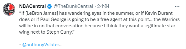 Anthony Slater表示:如果詹姆斯在今年夏天目光游离,或者杜兰特有离开的心思,又或是乔治成为自由球员(合同本赛季结束后到期),我想勇士将会参与进去,因为我认为他们想要为库里寻找一位真正的明星侧翼搭档。
