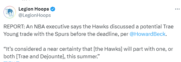 还有一位高管说老鹰在交易截止日前与马刺讨论了潜在的有关特雷-杨交易。在交易截止日前,他们还在兜售球队另一位明星后卫穆雷的事也广为人知,但始终找不到满意的交易方案。几乎可以肯定的是,他们将在今年夏天与其中一名或两名球员分道扬镳。