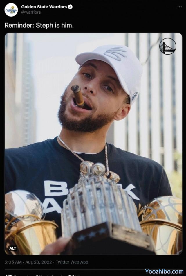 2022-23赛季,勇士将踏上卫冕之旅,库里能否延续上赛季的出色表现,也是大家关注的焦点。就在今天,勇士官推也晒出了一张库里的特写照,并配文写道:“提醒一下:斯蒂芬就是他。”照片上的库里,叼着一根雪茄,抱着他的奖杯们,歪着脑袋。