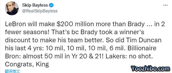 skip发推写道:勒布朗将比布雷迪多赚两亿美元并且还少了两个赛季!因为布雷迪愿意为了让他的球队变得更好而降薪;蒂姆-邓肯在他生涯最后的4年里也是如此,年薪仅仅只有1000万美元、1000万美元、1000万美元和600万美元;亿万富翁勒布朗,在生涯第20年和第21年的薪金都接近5000万美元!湖人队没有机会夺冠了,恭喜你国王。