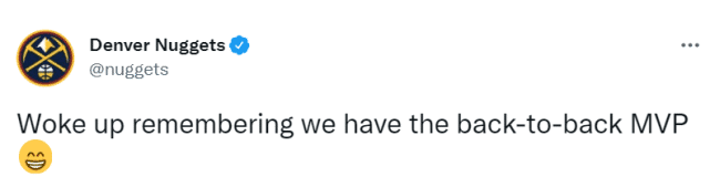 值得一提的是,这一次年终大战,MVP终于没被忘记。上赛季的年终大战,掘金并没有被安排比赛,引起一些争议,因为约基奇是之前一个赛季的MVP。而今年,约基奇已经是连庄MVP,掘金官推在社媒上曾晒出约基奇抱着MVP奖杯和马龙的合影,配文写道:“醒来要记得我们有背靠背MVP。”这一表态,疑似喊话联盟,如今,曝光的赛程里已经有了掘金,约基奇可以率队出战了。