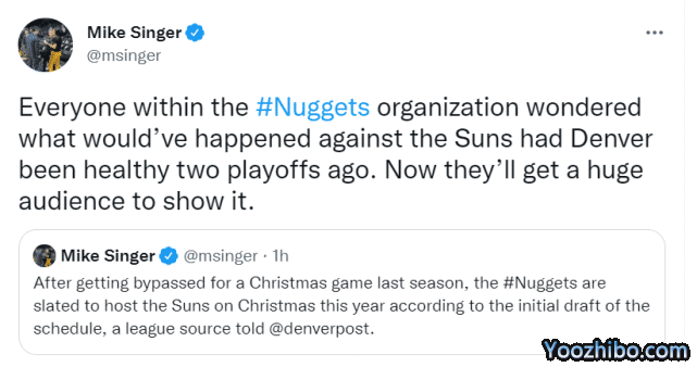 Mike Singer表示,掘金队内的每一个人都想知道 ,如果他们在两年前的季后赛能全员保持健康,对阵太阳会发生些什么。现在,他们将吸引大量球迷的关注,并证明一切。2021年季后赛,掘金在季后赛次轮0-4被太阳横扫出局,穆雷因伤缺阵。掘金和布克之间也曾在比赛中发生过不愉快。