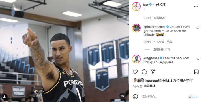 赛后,库兹马在Ins上晒出了自己的比赛集锦,配文写道:昨晚在犹他打得太开心了,很高兴能够为大家表演,期待下一次;詹姆斯在评论区写道:哈哈,我看到你耸肩了。”库兹马则回复:“哈哈,你知道现在是什么时候了。”