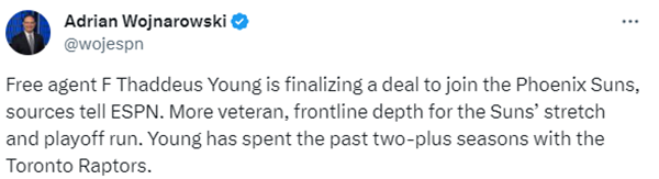 在今年交易截止日前,猛龙将施罗德和赛迪斯-杨交易到篮网,换来丁威迪;随后篮网裁掉赛迪斯-杨,如今杨与太阳签下一份新合同,双方签约至赛季结束。