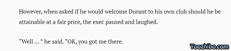 当被问到他们球队是否欢迎杜兰特加盟,该高管突然停下来并且笑了,然后说:嗯,好吧,你难住我了。