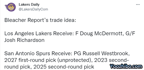 美媒列4换2交易方案:湖人送走威少、2027年不受保护首轮签、2023年次轮签和2025年次轮签,从马刺得到道格-麦克德莫特和约什-理查德森。