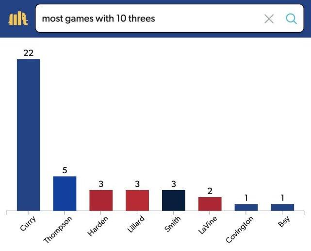 2、库里已经22次单场至少命中10记三分,该纪录排名历史第一;汤普森5次做到,哈登、利拉德和史密斯都是3次做到,拉文2次、科温顿1次和萨迪贝1次
