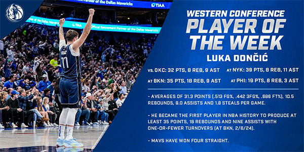 东契奇上周率领独行侠取得了4胜0负的战绩,场均可以得到31.3分10.5篮板8助攻——对阵76人拿到19分8篮板3助攻,对阵篮网拿到35分18篮板9助攻,对阵尼克斯拿到39分8篮板11助攻和对阵雷霆拿到32分8篮板9助攻。